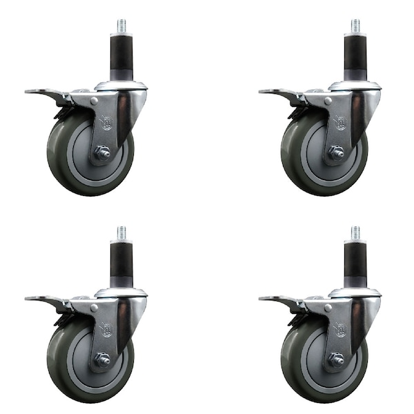 4'' Gray Poly Swivel 1-1/4'' Expanding Stem Caster Set Total Lock Brake, 4PK