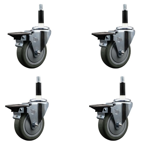 4'' Gray Poly Swivel 7/8'' Expanding Stem Caster Set with Brake, 4PK