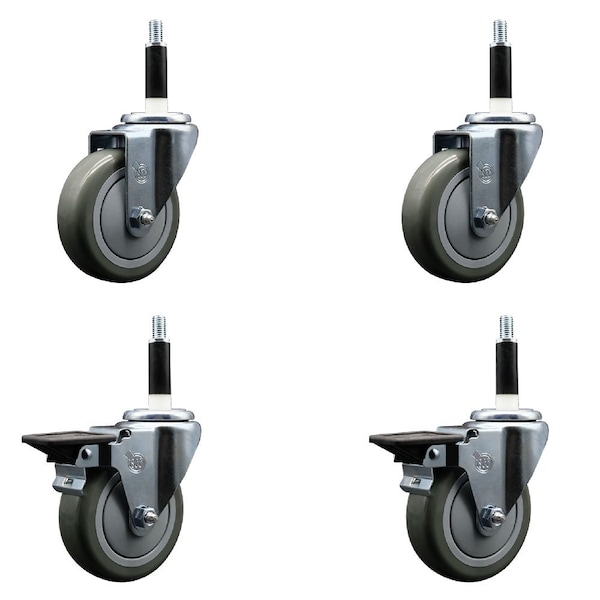 4'' Gray Poly Wheel Swivel 7/8'' Expanding Stem Caster Set 2 Brakes, 4PK