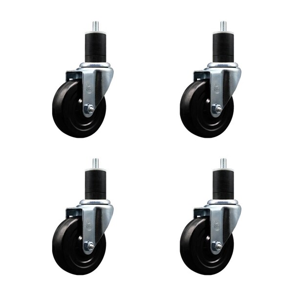 Listing is for a set of four 4 Service Caster Series #20 1-3/4'' expanding stem swivel casters with 4'' diameter by 1-1/4'' wide black hard rubber wheels capable of supporting a total weight of 1,200 lbs. 300 lbs./caster.. When searching for a reliable and durable solution to your caster needs, look no further than the Service Caster Series 20 expanding stem hard rubber wheel casters. The Series #20 features an innovative expanding stem that can easily adapt to the inside diameter of the opening, allowing for a secure fit in round or square tubes. Simply tighten the topmost knurled nut to compress the rubber for a snug fit. For added security, further compress the rubber with a wrench via the nut under the swivel raceway. Finely crafted with a bright zinc plated finish, heat-treated ball bearing raceway, and a hard rubber wheel, this versatile caster is ideal for work tables, shop projects, or any equipment with round or square tube legs. Service Caster is unsurpassed in quality, reliability, and excellent customer service. Count on us to move you forward.