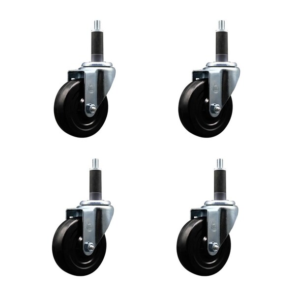 Listing is for a set of four 4 Service Caster Series #20 1'' expanding stem swivel casters with 4'' diameter by 1-1/4'' wide black hard rubber wheels capable of supporting a total weight of 1,200 lbs. 300 lbs./caster.. When searching for a reliable and durable solution to your caster needs, look no further than the Service Caster Series 20 expanding stem hard rubber wheel casters. The Series #20 features an innovative expanding stem that can easily adapt to the inside diameter of the opening, allowing for a secure fit in round or square tubes. Simply tighten the topmost knurled nut to compress the rubber for a snug fit. For added security, further compress the rubber with a wrench via the nut under the swivel raceway. Finely crafted with a bright zinc plated finish, heat-treated ball bearing raceway, and a hard rubber wheel, this versatile caster is ideal for work tables, shop projects, or any equipment with round or square tube legs. Service Caster is unsurpassed in quality, reliability, and excellent customer service. Count on us to move you forward.