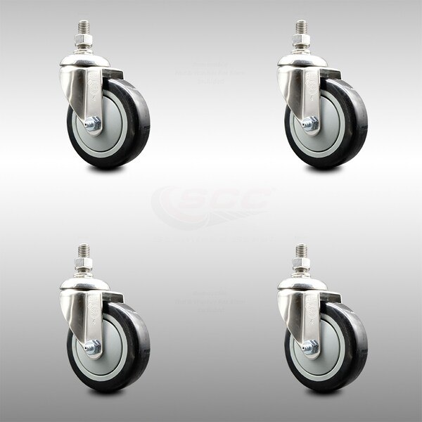 4 Inch 316SS Black Polyurethane Wheel Swivel 10mm Threaded Stem Caster Set