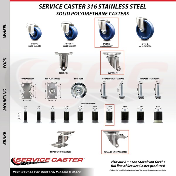Listing is for a set of four (4) Service Caster Series #20 1-1/2" expanding stem 316 stainless steel swivel casters with 4" diameter by 1-1/4" wide solid polyurethane wheels and total locking brakes capable of supporting a total weight of 1,200 lbs. (300 lbs./caster). When searching for a reliable and durable solution to your caster needs, consider Service Caster's 316 stainless steel solid polyurethane wheel casters. Built with 316 stainless steel, which contains additional molybdenum and nickel content, makes this caster more corrosion resistant than standard 304 stainless steel. Molded as one solid piece, the non-marking, non-marring polyurethane wheel is free from debonding, and will not flatspot, as can occur with comparable polyurethane wheels, ensuring a smooth and solid roll over long periods of time. Mounting options include top plate, bolt hole, expanding stem and standard and metric threaded stem sizes. These versatile casters are ideal for a wide range of applications, such as dollies, platform trucks, warehouse carts and freight terminals. Or ensure a secure ride for food service carts, hotel housekeeping carts, and industrial and commercial equipment.