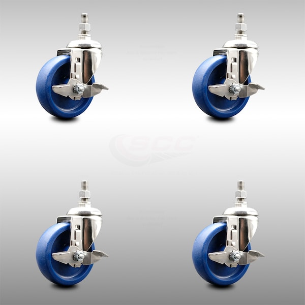 Listing is for a set of four (4) Service Caster Series #20 stainless steel swivel casters, four (4) swivel 1/2" threaded stem casters with top lock brakes, 4” diameter by 1-1/4” wide solid polyurethane wheels. Supports a total weight of 1,200lbs (300lbs/per caster). When searching for a reliable and durable solution to your caster needs, consider Service Caster's 316 stainless steel solid polyurethane wheel casters. Built with 316 stainless steel, which contains additional molybdenum and nickel content, makes this caster more corrosion resistant than standard 304 stainless steel. Molded as one solid piece, the non-marking, non-marring polyurethane wheel is free from debonding, and will not flatspot, as can occur with comparable polyurethane wheels, ensuring a smooth and solid roll over long periods of time. Mounting options include top plate, bolt hole, expanding stem and standard and metric threaded stem sizes. These versatile casters are ideal for a wide range of applications, such as dollies, platform trucks, warehouse carts and freight terminals. Or ensure a secure ride for food service carts, hotel housekeeping carts, and industrial and commercial equipment.