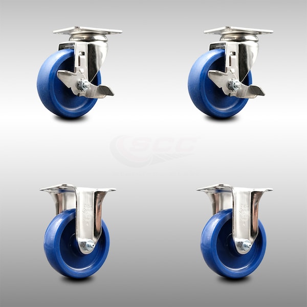 Listing is for a a set of four (4) Service Caster Series #20 316 stainless steel casters, two (2) rigid and two (2) swivel casters with top locking brakes, with 4" diameter by 1-1/4" wide blue solid polyurethane wheels capable of supporting a total weight of 1,200 lbs. (300 lbs./caster). When searching for a reliable and durable solution to your caster needs, consider Service Caster's 316 stainless steel solid polyurethane wheel casters. Built with 316 stainless steel, which contains additional molybdenum and nickel content, makes this caster more corrosion resistant than standard 304 stainless steel. Molded as one solid piece, the non-marking, non-marring polyurethane wheel is free from debonding, and will not flatspot, as can occur with comparable polyurethane wheels, ensuring a smooth and solid roll over long periods of time. Mounting options include top plate, bolt hole, expanding stem and standard and metric threaded stem sizes. These versatile casters are ideal for a wide range of applications, such as dollies, platform trucks, warehouse carts and freight terminals. Or ensure a secure ride for food service carts, hotel housekeeping carts, and industrial and commercial equipment.