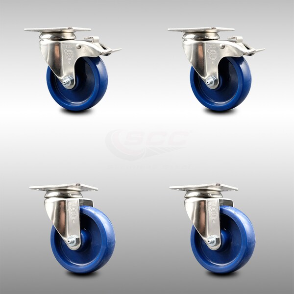 Listing is for a set of four (4) Service Caster Series #20 316 stainless steel casters, two (2) swivel total lock brake swivel casters and two (2) swivel casters, with 4” diameter by 1-1/4” wide blue solid polyurethane wheels. Supports a total weight of 1,200lbs (300lbs/per caster). When searching for a reliable and durable solution to your caster needs, consider Service Caster's 316 stainless steel solid polyurethane wheel casters. Built with 316 stainless steel, which contains additional molybdenum and nickel content, makes this caster more corrosion resistant than standard 304 stainless steel. Molded as one solid piece, the non-marking, non-marring polyurethane wheel is free from debonding, and will not flatspot, as can occur with comparable polyurethane wheels, ensuring a smooth and solid roll over long periods of time. Mounting options include top plate, bolt hole, expanding stem and standard and metric threaded stem sizes. These versatile casters are ideal for a wide range of applications, such as dollies, platform trucks, warehouse carts and freight terminals. Or ensure a secure ride for food service carts, hotel housekeeping carts, and industrial and commercial equipment.