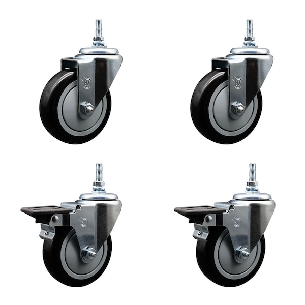 4 Inch Black Polyurethane 12 MM Threaded Stem Caster Set 2 Brakes SCC