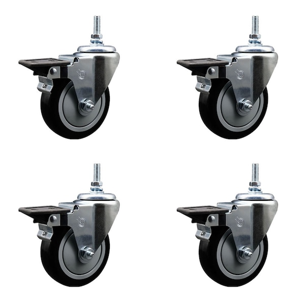 4 Inch Black Polyurethane 38 Inch Threaded Stem Caster Set with Brake