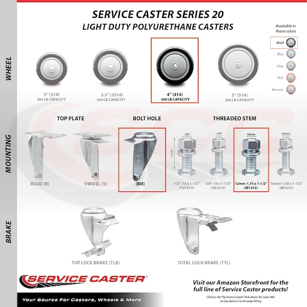 Listing is for one (1) Service Caster Series #20 swivel caster with a 4" diameter by 1-1/4" wide black polyurethane wheel and a 12mm metric threaded stem capable of supporting 300 lbs./caster.When searching for a reliable and durable solution to your caster needs, consider Service Caster’s Series 20 threaded stem polyurethane casters. The Service Caster Series #20 is ideal for light and medium duty material handling, carts, equipment, and shop projects. The bolt hole can accept a bolt or a customized stem, allowing for any type of mounting requirement. The zinc plated finish provides durability under any condition, while the non-marking, non-marring polyurethane wheels perform especially well on hard surfaces such as concrete, tile, and wood. All rolling on a finely crafted ball bearing design that will keep you moving forward. Service Caster is unsurpassed in quality, reliability, and excellent customer service. Count on us to move you forward.