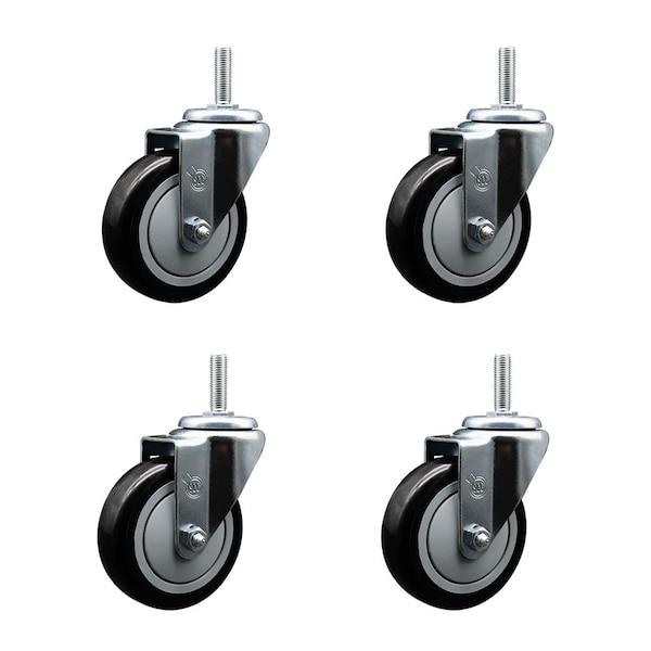 4 Inch Black Polyurethane Wheel Swivel 34 Inch Threaded Stem Caster Set Service Caster