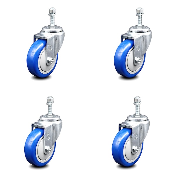 4 Inch Blue Polyurethane Wheel Swivel 10mm Threaded Stem Caster Set SCC