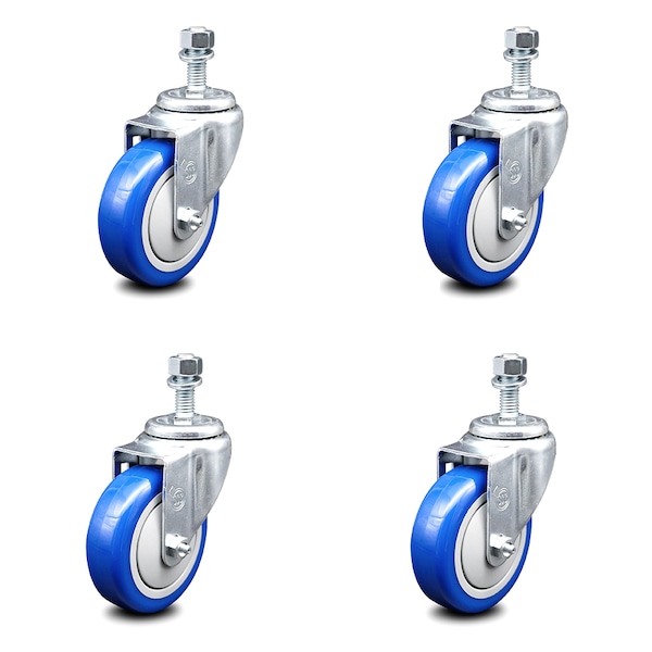4 Inch Blue Polyurethane Wheel Swivel 1/2 Inch Threaded Stem Caster Set SCC