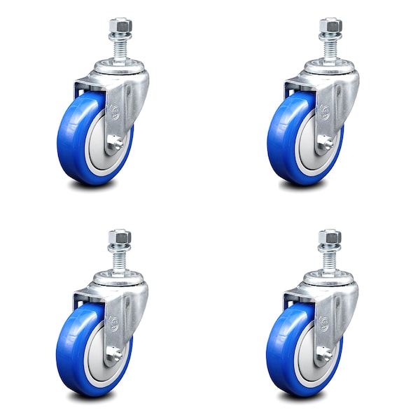 4 Inch Blue Polyurethane Wheel Swivel 12mm Threaded Stem Caster Set SCC