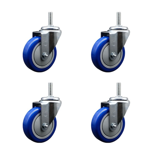 4 Inch Blue Polyurethane Wheel Swivel 58 Inch Threaded Stem Caster Set Service Caster