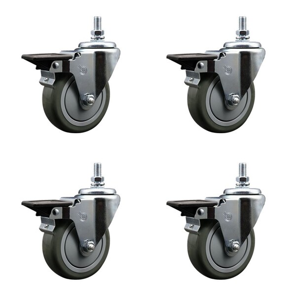 Listing is for a set of four 4 Service Caster Series 20 swivel casters, four 4 swivel 12 threaded stem casters with posi lock brakes, 4 diameter by 114 wide gray polyurethane wheels Supports a total weight of 1,400lbs 350lbsper caster When searching for a reliable and durable solution to your caster needs, consider Service Casters Series 20 threaded stem polyurethane casters The Service Caster Series 20 is ideal for light and medium duty material handling, carts, equipment, and shop projects The bolt hole can accept a bolt or a customized stem, allowing for any type of mounting requirementThe zinc plated finish provides durability under any condition, while the nonmarking, nonmarring polyurethane wheels perform especially well on hard surfaces such as concrete, tile, and wood All rolling on a finely crafted ball bearing design that will keep you moving forward