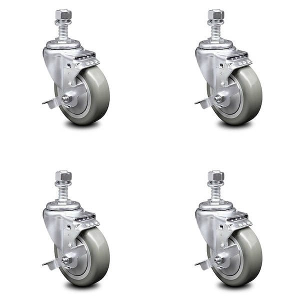 4 Inch Gray Polyurethane Swivel 12mm Threaded Stem Caster Set with Brake SCC