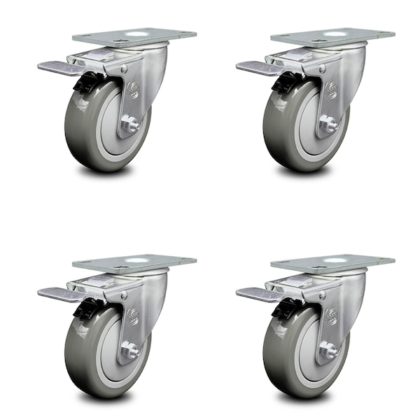 4 Inch Gray Polyurethane Swivel Top Plate Caster Set with Total Lock Brake SCC
