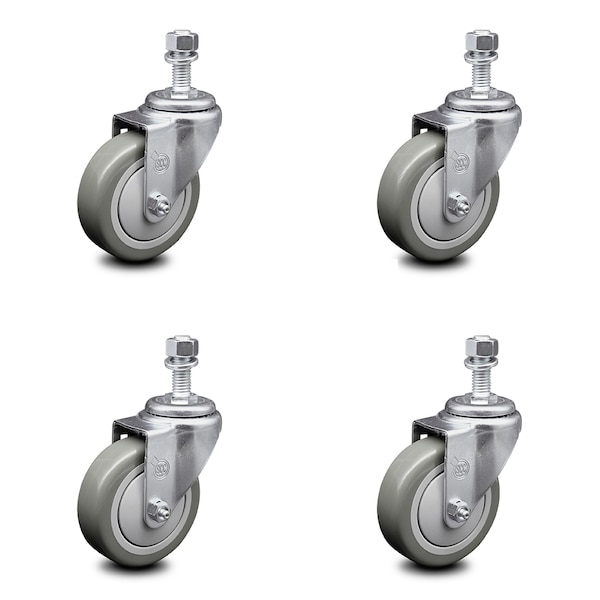 4 Inch Gray Polyurethane Wheel Swivel 12mm Threaded Stem Caster Set SCC