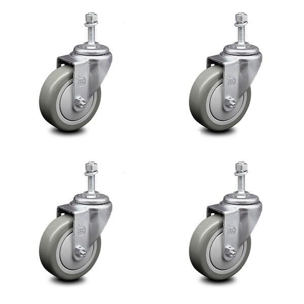 4 Inch Gray Polyurethane Wheel Swivel 3/8 Inch Threaded Stem Caster Set SCC