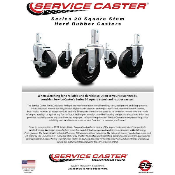 Listing is for one (1) Service Caster Series #20 swivel caster with a 4” diameter by 1-1/4” wide black hard rubber wheel and a 7/8" square stem capable of supporting 300lbs./caster. When searching for a reliable and durable solution to your caster needs, consider Service Caster’s Series 20 square stem hard rubber casters. The Service Caster Series 20 is ideal for light and medium duty material handling, carts, equipment, and shop projects. The hard rubber wheels not only provide higher load capacities and impact resistance than comparable wheels, but are also resistant to most chemicals and oils. The square stems are designed to be bolted or riveted onto the inside of angled iron legs or against any flat surface. All rolling on a finely crafted ball bearing design and zinc plated finish that provides durability under any condition and keeps you safely moving forward. Service Caster is unsurpassed in quality, reliability, and excellent customer service. Count on us to move you forward.
