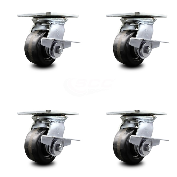 4 Inch Heavy Duty Phenolic Caster Set with Roller Bearings and Brakes SCC