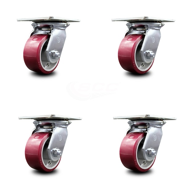 Listing is for a set of four (4) Service Caster Series #35 swivel casters with 4" diameter by 2" wide polyurethane on aluminum wheels capable of supporting a total weight of 2,800 lbs. (700 lbs. per caster). When searching for a reliable and durable solution to your caster needs, rely on Service Caster Series 35 polyurethane aluminum wheel casters. The Series #35 features heavy duty polyurethane wheels that are chemically bonded to an aluminum core, providing a smooth roll over uneven surfaces without marking or marring floors. Finely crafted with a bright zinc plated finish and heat-treated ball bearing raceway, these versatile casters are ideal for a wide range of applications. Use on dollies, platform trucks, warehouse carts and freight terminals, or ensure a smooth and secure ride for food service carts, hotel housekeeping carts, and industrial and commercial equipment. Even drywall carts, welding carts, and wall panel carts will be ready to roll on the Series 35, keeping you moving forward.