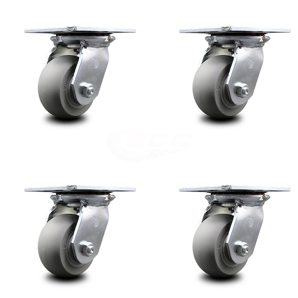 Listing is for a set of four (4) Service Caster Series #35 swivel casters with 4" diameter by 2" wide thermoplastic rubber donut tread wheels capable of supporting a total weight of 1,200 lbs. (300 lbs. per caster). When searching for a reliable and durable solution for medium and heavy duty projects, consider Service Caster’s Series 35 thermoplastic rubber donut tread on polyolefin core casters. The rounded face “donut” style soft tread is made of thermoplastic rubber that is non-marking, non-marring and provides easier mobility over standard flat tread wheels, resulting in a long lasting, high capacity wheel capable of easy rolling under heavy loads. Finely crafted with double ball bearing heat treated raceways, these versatile casters are ideal for a wide range of applications, such as dollies, platform trucks, warehouse carts and freight terminals. Or ensure a smooth and secure ride for food service carts, hotel housekeeping carts, and industrial and commercial equipment. Even drywall carts, welding carts, and wall panel carts will be ready to roll on the Series 35, keeping you moving forward.