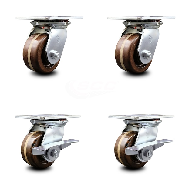 4 Inch High Temp Phenolic Swivel Caster Set with Roller Bearings 2 Brakes SCC