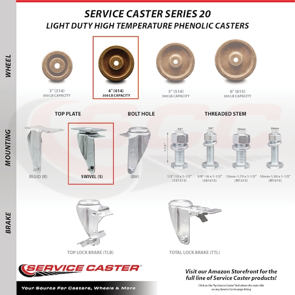 Listing is for one (1) Service Caster Series #20 swivel caster with a 4" diameter by 1-1/4" wide high temperature phenolic wheel capable of supporting 300lbs./caster.When searching for a reliable and durable solution to your caster needs, consider Service Caster’s Series 20 roller bearing high temperature phenolic casters. The Service Caster Series #20 is ideal for bakery racks, light and medium duty material handling, carts, equipment, and shop projects. The zinc plated finish provides durability under any condition, and the high temp phenolic wheels- quieter than comparable steel wheels- have a high resistance to impact damage, providing protection for floors in commercial and industrial settings. The roller bearing is capable of carrying greater loads while also providing smoother rolling motion. It has a split outer race shell into which the roller assembly is inserted. Combination seal/thrust retainer washers protect the bearing from dirt, water, and chemicals. They also help absorb thrust friction (Note: roller bearing must be used with hardened spanner bushing or hardened shaft). This caster is ideal for use in high temperatures associated with baking, performing consistently in temperature ratings of 475°F continuous usage to 525°F intermittent usage. Not only are they resistant to water, oil, and grease, but because they are non-metallic, these wheels are spark proof, keeping you safely moving forward. Mounting options include top plate, bolt hole and standard and metric threaded stem sizes. Service Caster is unsurpassed in quality, reliability, and excellent customer service. Count on us to move you forward.