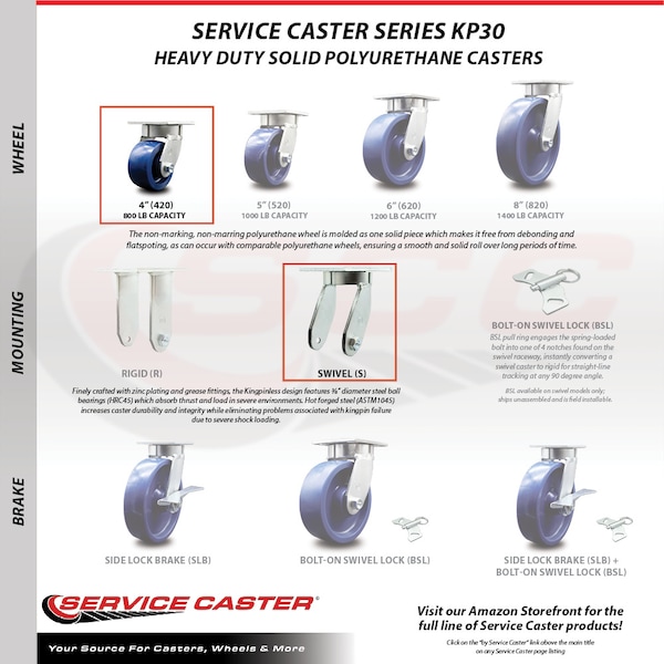 Listing is for a set of four (4) Service Caster Series #KP30 casters, two (2) swivel and two (2) rigid casters, with 4" diameter by 2" wide solid polyurethane wheels capable of supporting a total weight of 2,800 lbs. (700 lbs./caster). When searching for a reliable and durable solution to your caster needs, consider Service Caster Series KP30 solid polyurethane wheel casters. The Service Caster Series KP30 features a non-marking, non-marring polyurethane wheel. Molded as one solid piece, this wheel is free from debonding, and will not flatspot, as can occur with comparable polyurethane wheels, ensuring a smooth and solid roll over long periods of time. Featuring a Kingpinless hot forged ASTM1045 steel design that increases caster durability and integrity, the series KP30 eliminates problems associated with kingpin failure due to severe shock loading. In addition, the Kingpinless design features 3/8” diameter HRC45 steel ball bearings which absorb thrust and load in severe environments. Lastly, Service Caster’s Series KP30 casters are finely crafted with grease fittings, and 4 position notches to accept 4-position locks. These highly versatile casters are ideal for a wide range of applications, such as dollies, platform trucks, warehouse carts and freight terminals. Even drywall carts, welding carts, and wall panel carts will be ready to roll on the Series KP30, keeping you moving forward.