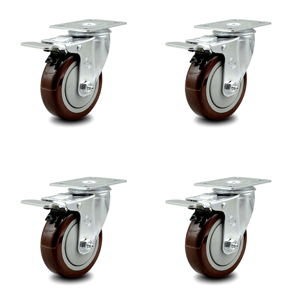 4 Inch Maroon Polyurethane Swivel Top Plate Caster Set with Total Lock Brake SCC