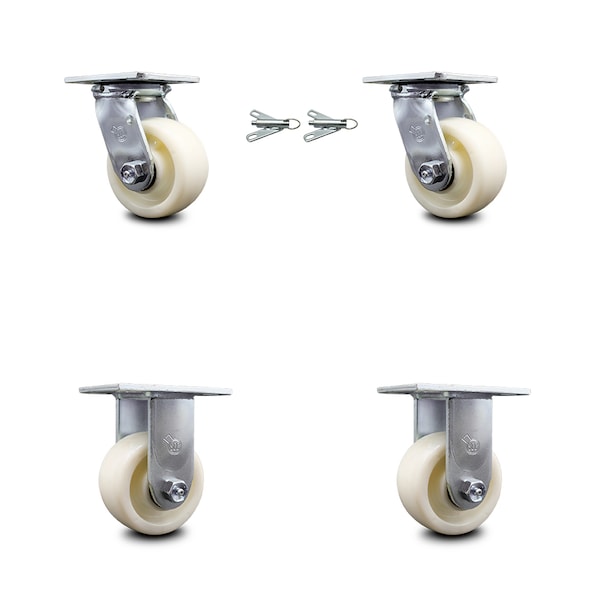 Listing is for a set of four (4) Service Caster Series #30 casters, two (2) swivel casters with bolt on swivel locks and two (2) rigid casters, with 4" diameter by 2" wide nylon wheels capable of supporting a total weight of 3,200 lbs. (800 lbs./caster).When searching for a reliable and durable heavy duty solution to your caster needs, consider Service Caster’s Series 30 nylon wheel casters.The Service Caster Series #30 is ideal for medium and heavy duty material handling, carts, equipment, and shop projects. The zinc plated finish provides durability under any condition and the nylon wheels provide very low rolling resistance, show a high resistance to many aggressive substances and under normal operating conditions are maintenance free. Resistant to most chemical and oils, these nylon wheels will keep you safely moving forward. Service Caster is unsurpassed in quality, reliability, and excellent customer service. Count on us to move you forward.