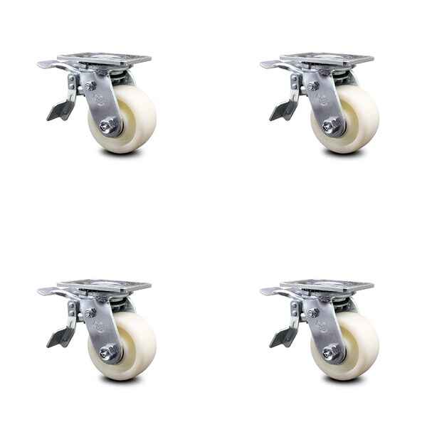 Listing is for a set of four (4) Service Caster Series #30 swivel casters with 4" diameter by 2" wide nylon wheels with total lock brakes capable of supporting a total weight of 3,200 lbs. (800 lbs. per caster). When searching for a reliable and durable heavy duty solution to your caster needs, consider Service Caster’s Series 30 nylon wheel casters.The Service Caster Series #30 is ideal for medium and heavy duty material handling, carts, equipment, and shop projects. The zinc plated finish provides durability under any condition and the nylon wheels provide very low rolling resistance, show a high resistance to many aggressive substances and under normal operating conditions are maintenance free. Resistant to most chemical and oils, these nylon wheels will keep you safely moving forward. Service Caster is unsurpassed in quality, reliability, and excellent customer service. Count on us to move you forward.