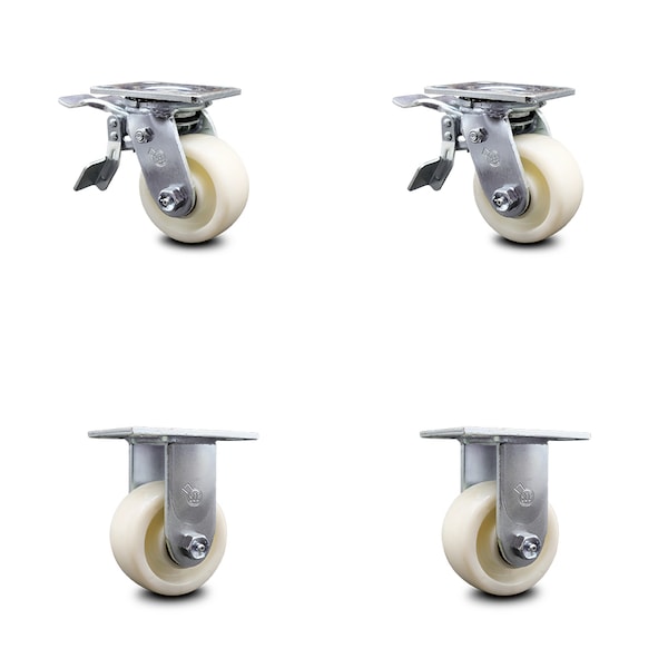 Listing is for a set of four (4) Service Caster Series #30 casters, two (2) swivel with total lock brakes and two (2) rigid casters, with 4" diameter by 2" wide nylon wheels capable of supporting a total weight of 3,200 lbs. (800 lbs./caster).When searching for a reliable and durable heavy duty solution to your caster needs, consider Service Caster’s Series 30 nylon wheel casters.The Service Caster Series #30 is ideal for medium and heavy duty material handling, carts, equipment, and shop projects. The zinc plated finish provides durability under any condition and the nylon wheels provide very low rolling resistance, show a high resistance to many aggressive substances and under normal operating conditions are maintenance free. Resistant to most chemical and oils, these nylon wheels will keep you safely moving forward. Service Caster is unsurpassed in quality, reliability, and excellent customer service. Count on us to move you forward.