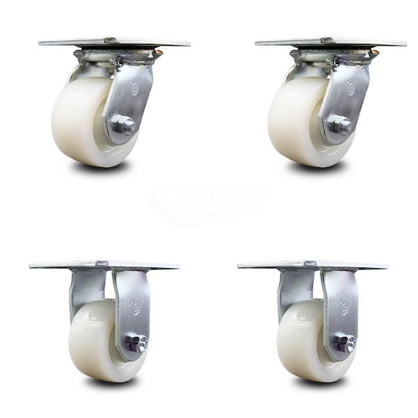 Listing is for a set of four (4) Service Caster Series #35 casters, two (2) swivel and two (2) rigid casters, with 4" diameter by 2" wide nylon wheels capable of supporting a total weight of 3,200 lbs. (800 lbs./caster). When searching for a reliable and durable heavy duty solution to your caster needs, consider Service Caster’s Series 35 nylon wheel casters. The Service Caster Series #35 is ideal for medium and heavy duty material handling, carts, equipment, and shop projects. The zinc plated finish provides durability under any condition and the nylon wheels provide very low rolling resistance, show a high resistance to many aggressive substances and under normal operating conditions are maintenance free. Resistant to most chemical and oils, these nylon wheels will keep you safely moving forward. Service Caster is unsurpassed in quality, reliability, and excellent customer service. Count on us to move you forward.