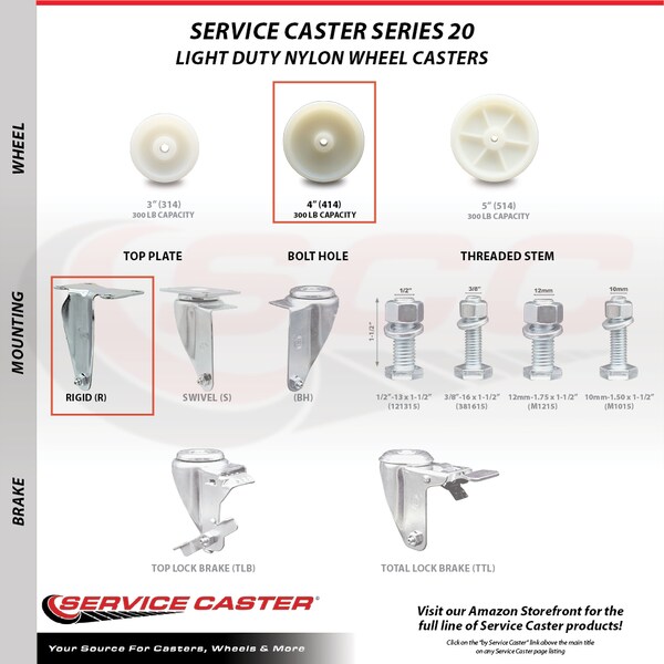 Listing is for one (1) Service Caster Series #20 rigid caster with a 4" diameter by 1-1/4" wide nylon wheel capable of supporting 300lbs./caster. When searching for a reliable and durable solution to your caster needs, consider Service Caster Series 20 top plate nylon wheel casters. The Service Caster Series #20 is ideal for light and medium duty material handling, carts, equipment, and shop projects. The zinc plated finish provides durability under any condition, and the nylon wheels provide very low rolling resistance, show a high resistance to many aggressive substances, and are maintenance free under normal operating conditions. Not only are they resistant to most chemicals and oils, but they will be sure to keep you safely moving forward. Service Caster is unsurpassed in quality, reliability, and excellent customer service. Count on us to move you forward.