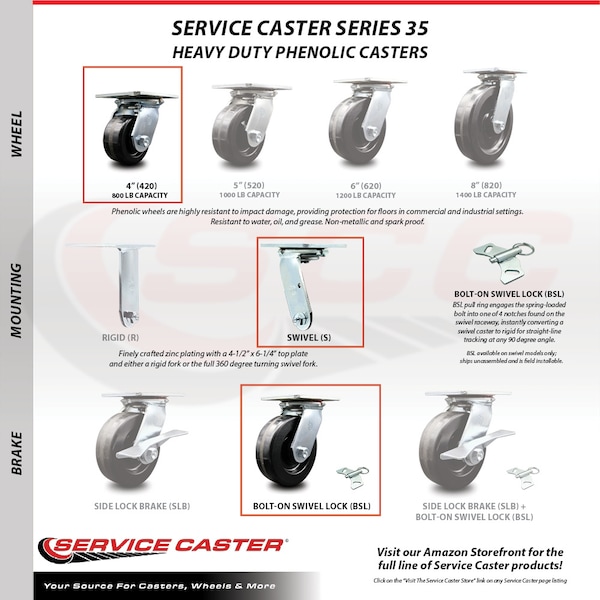 Listing is for a set of four (4) Service Caster Series #35 swivel casters with 4" diameter by 2" wide phenolic wheels with bolt on swivel locks and maintenance free precision ball wheel bearings. Capable of supporting a total weight of 3,200 lbs. (800 lbs. per caster). When searching for a reliable and durable solution to your caster needs, consider Service Caster Series 35 phenolic wheel casters. The Service Caster Series #35 is ideal for medium and heavy duty material handling, carts, equipment, and shop projects. The zinc plated finish provides durability under any condition, and the phenolic resin wheels are highly resistant to impact damage, providing protection for floors in commercial and industrial settings. Not only are they resistant to water, oil, and grease, but because they are non-metallic, these wheels are spark proof, keeping you safely moving forward.