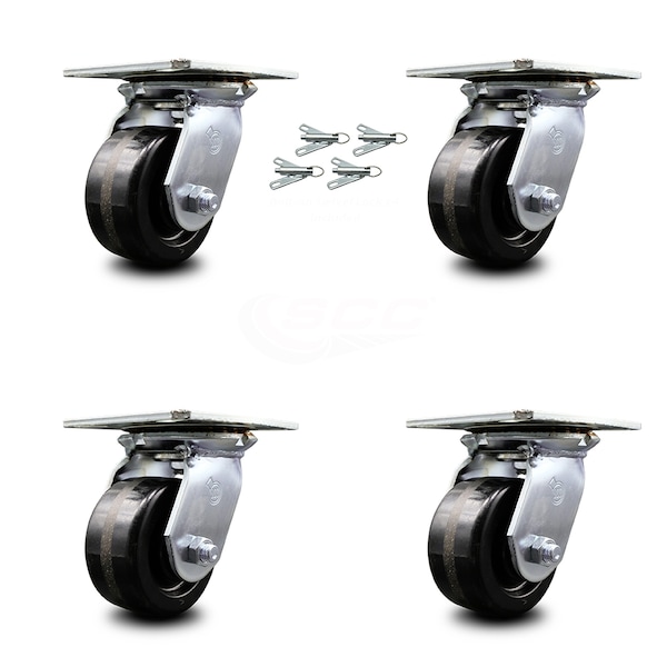 Listing is for a set of four (4) Service Caster Series #35 swivel casters with 4" diameter by 2" wide phenolic wheels with bolt on swivel locks capable of supporting a total weight of 3,200 lbs. (800 lbs. per caster). When searching for a reliable and durable solution to your caster needs, consider Service Caster Series 35 phenolic wheel casters. The Service Caster Series #35 is ideal for medium and heavy duty material handling, carts, equipment, and shop projects. The zinc plated finish provides durability under any condition, and the phenolic resin wheels are highly resistant to impact damage, providing protection for floors in commercial and industrial settings. Not only are they resistant to water, oil, and grease, but because they are non-metallic, these wheels are spark proof, keeping you safely moving forward.