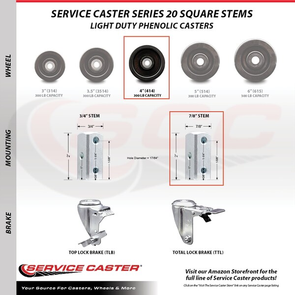 Listing is for one (1) Service Caster Series #20 swivel caster with a 4” diameter by 1-1/4” wide black phenolic wheel and a 7/8" square stem capable of supporting 300lbs./caster. When searching for a reliable and durable solution to your caster needs, consider Service Caster’s Series 20 square stem phenolic casters. The Service Caster Series 20 is ideal for light and medium duty material handling, carts, equipment, and shop projects. The zinc plated finish provides durability under any condition, and the phenolic resin wheels are highly resistant to impact damage, providing protection for floors in commercial and industrial settings. Not only are they resistant to water, oil, and grease, but because they are non-metallic, these wheels are spark proof, keeping you safely moving forward. The square stems are designed to be bolted or riveted onto the inside of angled iron legs or against any flat surface. Service Caster is unsurpassed in quality, reliability, and excellent customer service. Count on us to move you forward.