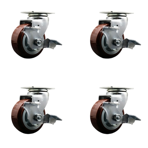 4 Inch Poly on Polyolefin Swivel Caster Set with Roller Bearings and Brakes SCC