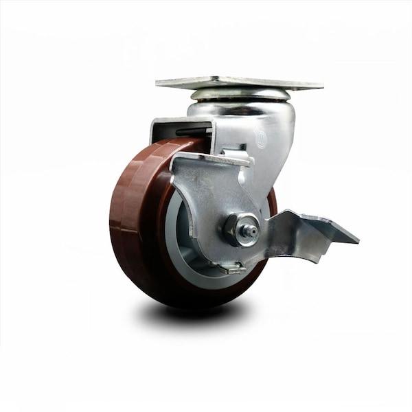 Listing is for one (1) Service Caster Series #20 swivel caster with a 4" diameter by 2" wide polyurethane on polyolefin wheel and roller bearing and a top locking brake capable of supporting 450 lbs./caster. When searching for a reliable and durable solution to your caster needs, consider Service Caster Series 20 polyurethane wheel casters. The Service Caster Series #20 features heavy duty non-marking polyurethane tread on a polyolefin core wheel, providing a smooth roll over uneven surfaces without marking or marring floors. These versatile casters are ideal for a wide range of applications, such as dollies, platform trucks, warehouse carts and freight terminals. Or ensure a smooth and secure ride for food service carts, hotel housekeeping carts, and industrial and commercial equipment. Even drywall carts, welding carts, and wall panel carts will be ready to roll on the Series 20, keeping you moving forward. Service Caster is unsurpassed in quality, reliability, and excellent customer service. Count on us to move you forward.
