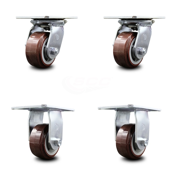 4 Inch Polyurethane Caster Set with Roller Bearings 2 Swivel 2 Rigid SCC