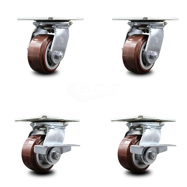 Listing is for a set of four (4) Service Caster Series #35 swivel casters, two (2) with side locking brakes, with 4" diameter by 2" wide polyurethane on polyolefin wheels and maintenance free precision ball wheel bearings. Capable of supporting a total weight of 2,400 lbs. (600 lbs./caster). When searching for a reliable and durable solution to your caster needs, consider Service Caster Series 35 polyurethane wheel casters. The Service Caster Series #35 features heavy duty non-marking polyurethane tread on a polyolefin core wheel, providing a smooth roll over uneven surfaces without marking or marring floors. These versatile casters are ideal for a wide range of applications, such as dollies, platform trucks, warehouse carts and freight terminals. Or ensure a smooth and secure ride for food service carts, hotel housekeeping carts, and industrial and commercial equipment. Even drywall carts, welding carts, and wall panel carts will be ready to roll on the Series 35, keeping you moving forward.