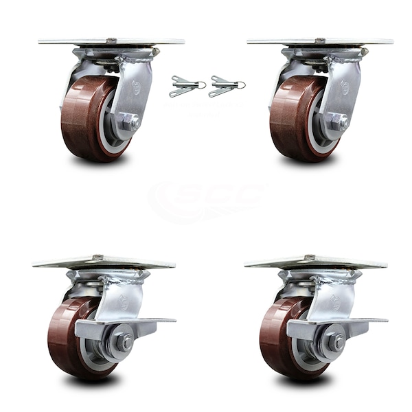 Listing is for a set of four (4) Service Caster Series #35 casters, two (2) swivel casters with bolt on swivel locks and two (2) swivel casters with side lock brakes, with 4" diameter by 2" wide polyurethane on polyolefin wheels and maintenance free precision ball wheel bearings. Capable of supporting a total weight of 2,400 lbs. (600 lbs./caster). When searching for a reliable and durable solution to your caster needs, consider Service Caster Series 35 polyurethane wheel casters. The Service Caster Series #35 features heavy duty non-marking polyurethane tread on a polyolefin core wheel, providing a smooth roll over uneven surfaces without marking or marring floors. These versatile casters are ideal for a wide range of applications, such as dollies, platform trucks, warehouse carts and freight terminals. Or ensure a smooth and secure ride for food service carts, hotel housekeeping carts, and industrial and commercial equipment. Even drywall carts, welding carts, and wall panel carts will be ready to roll on the Series 35, keeping you moving forward.