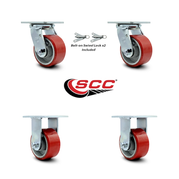 Listing is for a set of four (4) Service Caster Series #30 casters, two (2) swivel casters with bolt on swivel locks and two (2) rigid casters, with 4" diameter by 2" wide red polyurethane on cast iron wheel and maintenance free precision ball wheel bearings capable of supporting a total weight of 2,800 lbs. (700 lbs./caster). When searching for a reliable and durable solution for medium and heavy duty projects, consider Service Caster’s Series 30 polyurethane on metal wheel casters. The Service Caster Series #30 is ideal for material handling, carts, equipment, and shop projects. The non-marking, non-marring polyurethane tread performs especially well on hard surfaces such as concrete, tile, and wood, while the metal core wheel stands up to heavier loads with a stable and secure roll. Finely crafted with double ball bearing heat treated raceways, these versatile casters are ideal for a wide range of applications, such as dollies, platform trucks, warehouse carts and freight terminals. Or ensure a smooth and secure ride for food service carts, hotel housekeeping carts and industrial and commercial equipment. Even drywall carts, welding carts, and wall panel carts will be ready to roll on the Series 30, keeping you moving forward. Service Caster is unsurpassed in quality, reliability, and excellent customer service. Count on us to move you forward.