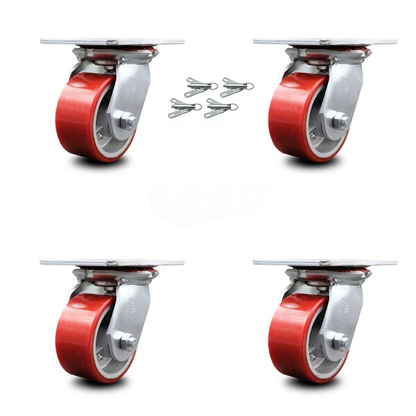 4 Inch Red Poly on Cast Iron Caster Set with Roller Bearings and Swivel Locks