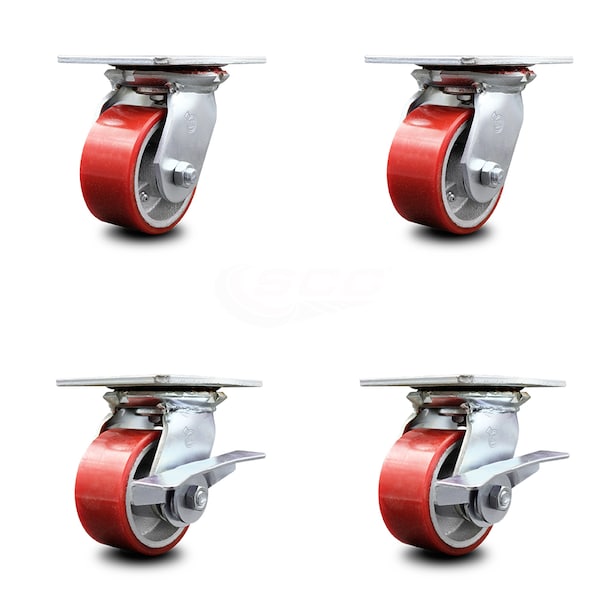 Listing is for a set of four (4) Service Caster Series #35 swivel casters, two (2) with side locking brakes, with 4" diameter by 2" wide polyurethane on cast iron wheels capable of supporting a total weight of 2,800 lbs. (700 lbs./caster). When searching for a reliable and durable solution for medium and heavy duty projects, consider Service Caster’s Series 35 polyurethane on metal wheel casters. The Service Caster Series #35 is ideal for material handling, carts, equipment, and shop projects. The non-marking, non-marring polyurethane tread performs especially well on hard surfaces such as concrete, tile, and wood, while the metal core wheel stands up to heavier loads with a stable and secure roll. Finely crafted with double ball bearing heat treated raceways, these versatile casters are ideal for a wide range of applications, such as dollies, platform trucks, warehouse carts and freight terminals. Or ensure a smooth and secure ride for food service carts, hotel housekeeping carts, and industrial and commercial equipment. Even drywall carts, welding carts, and wall panel carts will be ready to roll on the Series 35, keeping you moving forward.