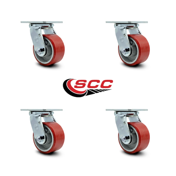 4 Inch Red Poly on Cast Iron Wheel Swivel Caster Set with Roller Bearings SCC
