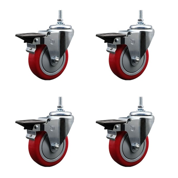 Listing is for a set of four 4 Service Caster Series 20 swivel casters, four 4 swivel 12MM threaded stem casters with posi lock brakes, 4 diameter by 114 wide red polyurethane wheels Supports a total weight of 1,400lbs 350lbsper caster When searching for a reliable and durable solution to your caster needs, consider Service Casters Series 20 threaded stem polyurethane casters The Service Caster Series 20 is ideal for light and medium duty material handling, carts, equipment, and shop projects The bolt hole can accept a bolt or a customized stem, allowing for any type of mounting requirementThe zinc plated finish provides durability under any condition, while the nonmarking, nonmarring polyurethane wheels perform especially well on hard surfaces such as concrete, tile, and wood All rolling on a finely crafted ball bearing design that will keep you moving forward