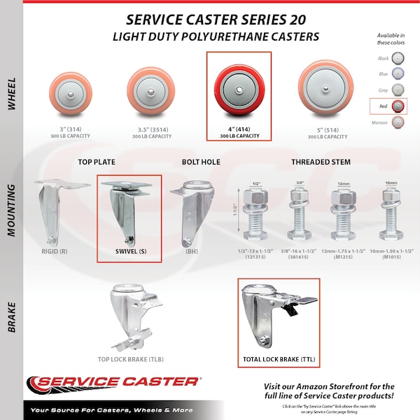 Listing is for a set of four (4) Service Caster Series #20 swivel casters, four (4) swivel casters with total lock brakes, 4” diameter by 1-1/4” wide red polyurethane wheels. Supports a total weight of 1,200lbs (300lbs/per caster). When searching for a reliable and durable solution to your caster needs, look no further than the Service Caster Series 20 top plate polyurethane casters. The Service Caster Series #20 is ideal for light and medium duty material handling, carts, equipment, and shop projects. The zinc plated finish provides durability under any condition, while the non-marking, non-marring polyurethane wheels perform especially well on hard surfaces such as concrete, tile, and wood- rolling on a finely crafted ball bearing design that keeps you moving forward. Service Caster is unsurpassed in quality, reliability, and excellent customer service. Count on us to move you forward.